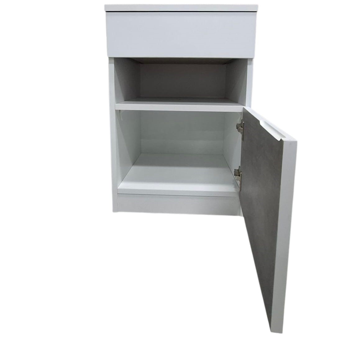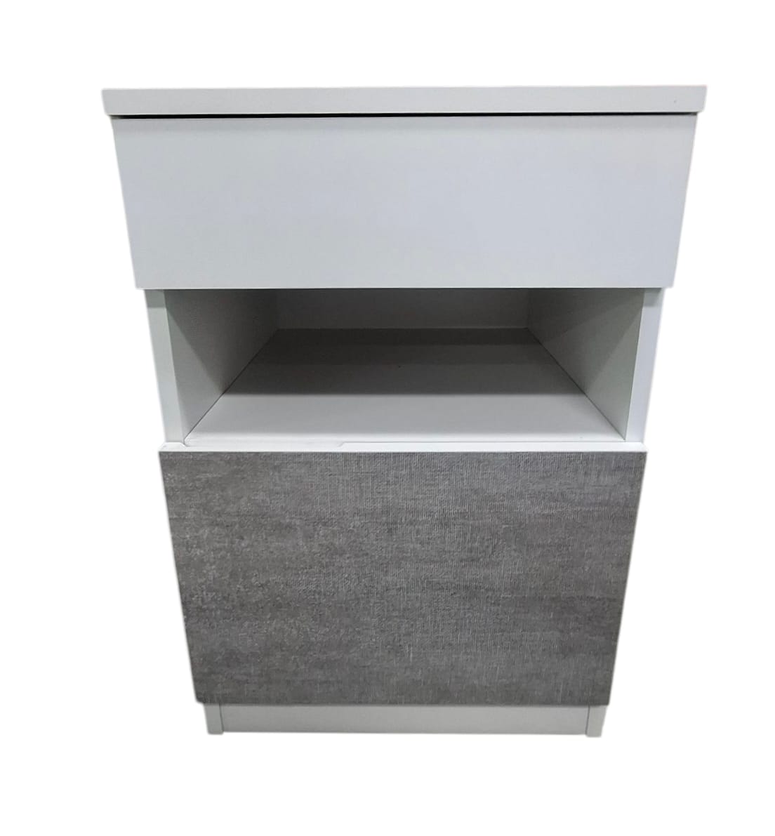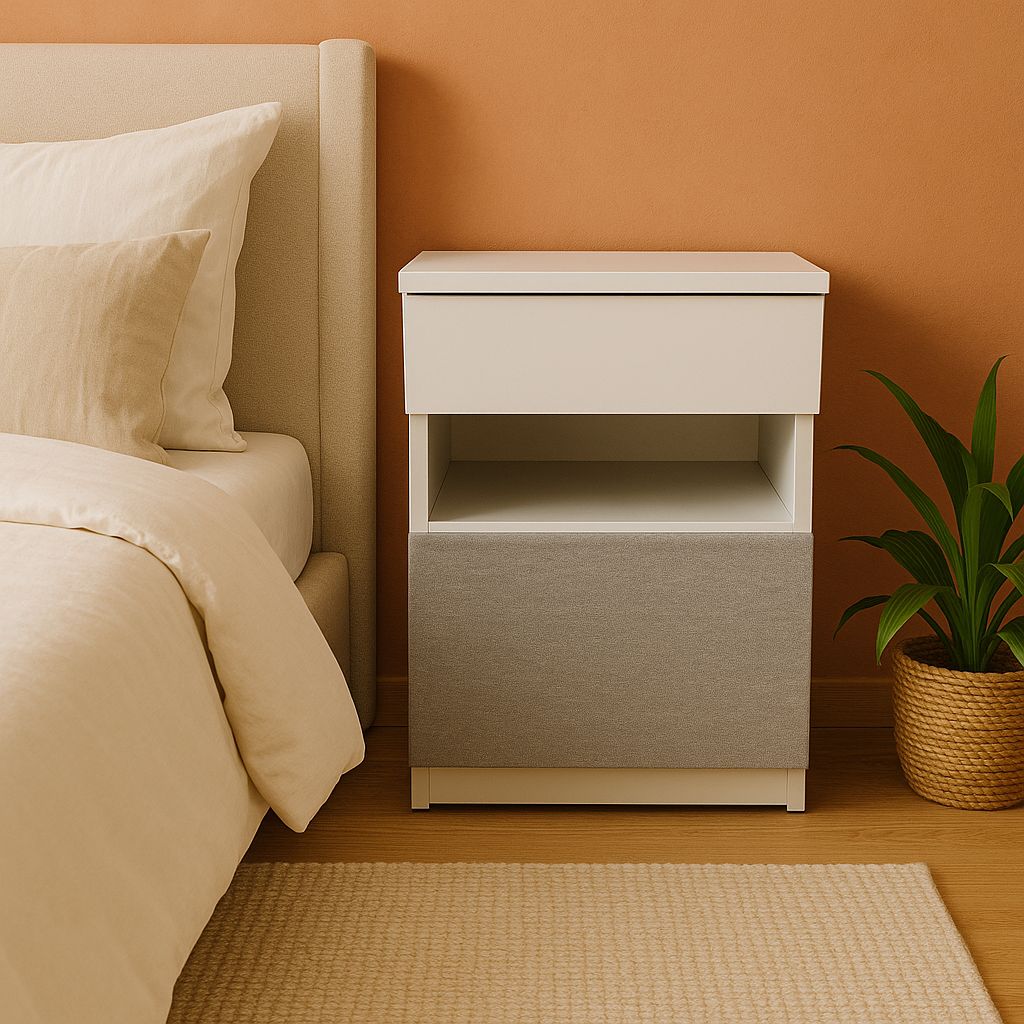 Esta mesa de luz se destaca por su versatilidad de almacenamiento: cuenta con un cajón para objetos personales que quieras mantener fuera de la vista, un estante con puerta para guardar de forma discreta o proteger del polvo, y un espacio de guardado descubierto, ideal para tu libro actual, una lámpara o dispositivos que necesites tener a mano.