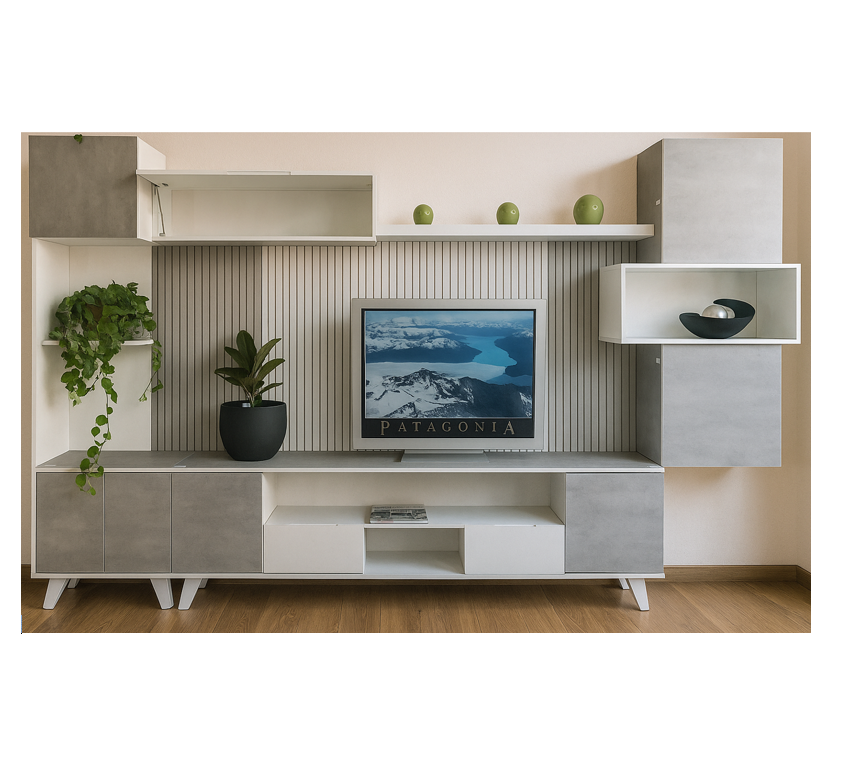 Un elemento distintivo de este rack es su panel posterior con varillado, que le aporta un toque de diseño único y una textura visual que realza su elegancia. Además, ofrece un amplio espacio de guardado, con una combinación inteligente de estantes abiertos para exhibir objetos decorativos, libros o dispositivos, y estantes con puertas para mantener el orden y ocultar lo que no quieras a la vista.